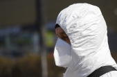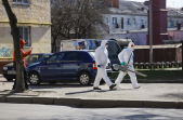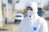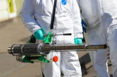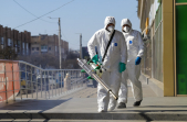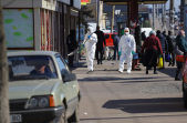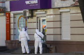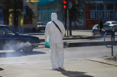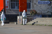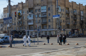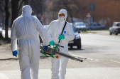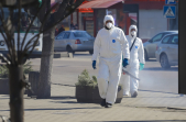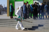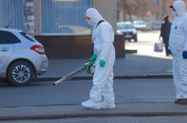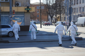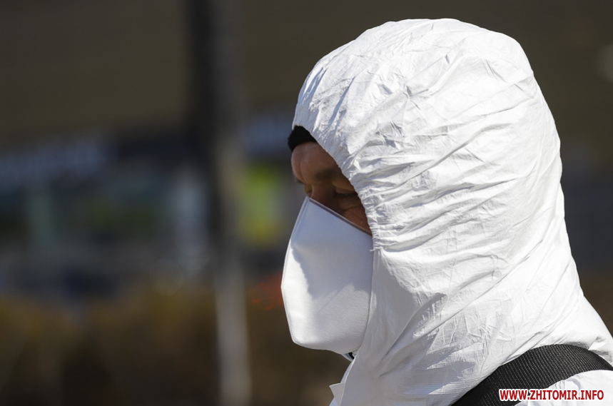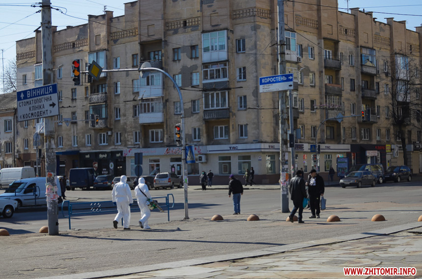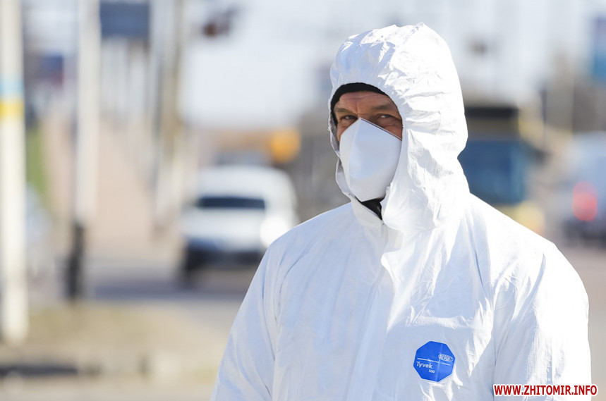 Під час карантину на вулицях Житомира все частіше можна зустріти людей в білих спецкостюмах, які дезінфікують зупинки, тротуари і будівлі.