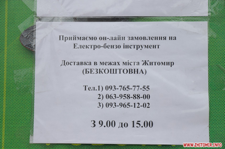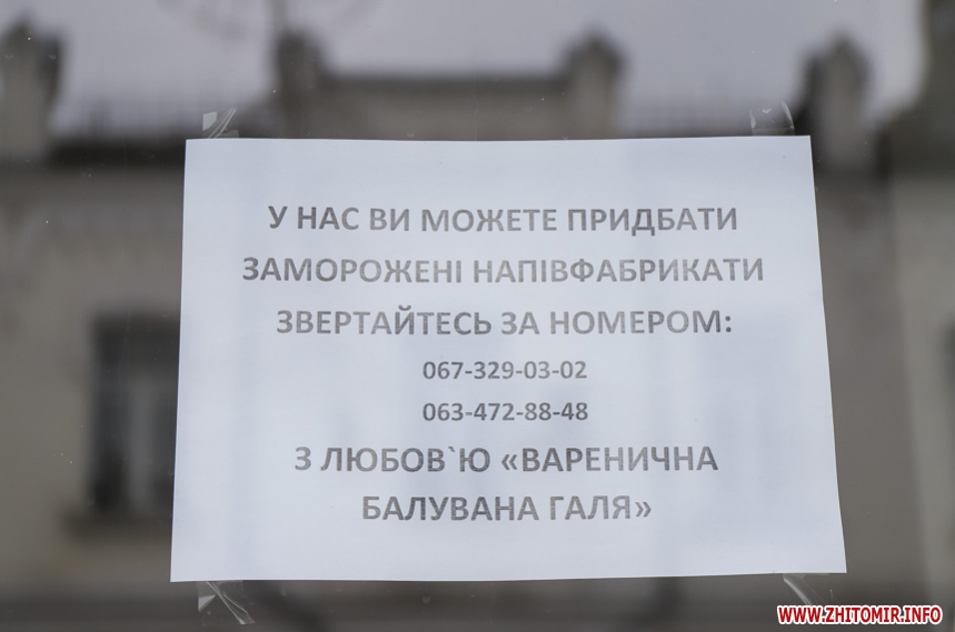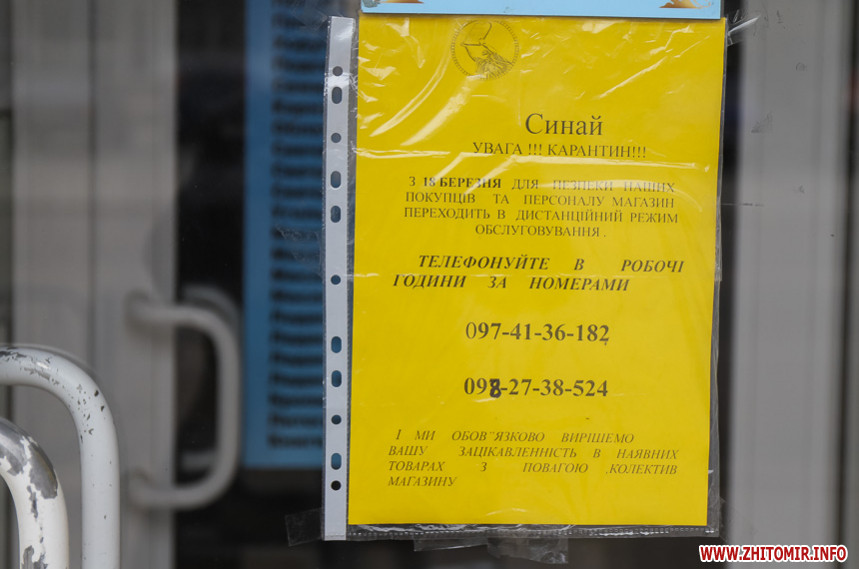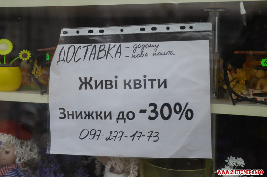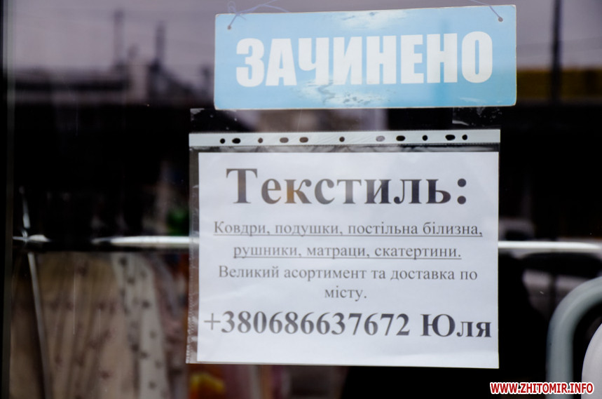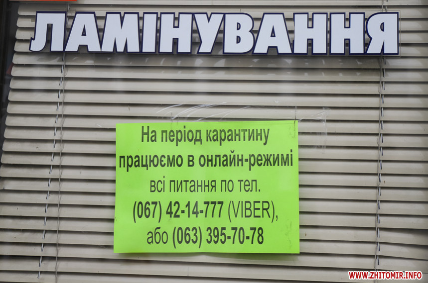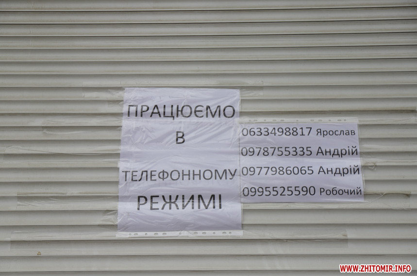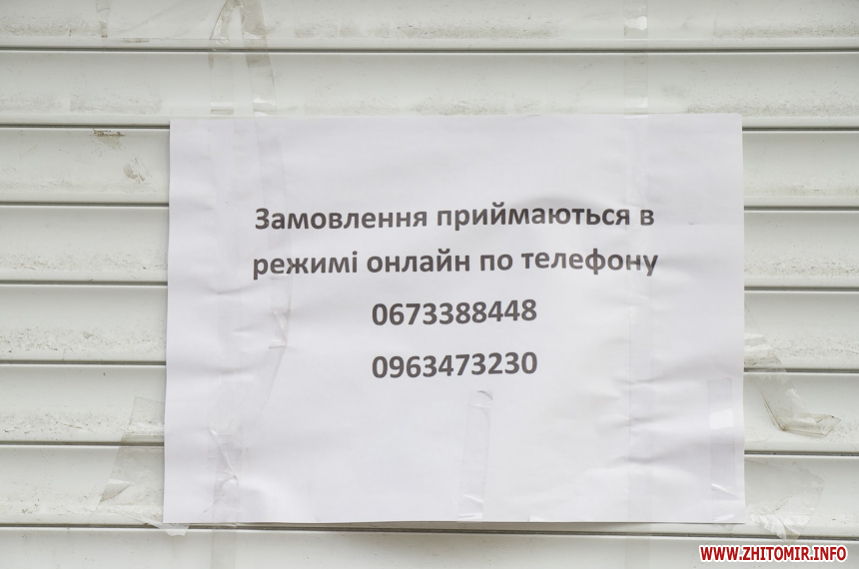 Не розгубилися, зокрема, власники дрібного житомирського бізнесу й перейшли на дистанційну роботу. На зачинених магазинах, кіосках на ринку все частіше можна побачити об'яви з координатами продавців. Купити електроінстументи, домашній текстиль, продукти, замовити готову їжу та навіть каву спокійно можна не виходячи з дому та не вистоюючи чергу на пошті чи у супермаркеті.