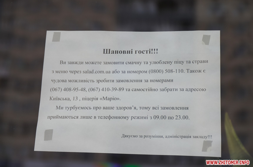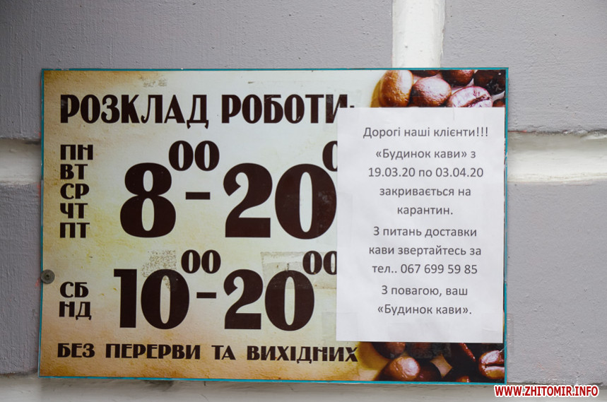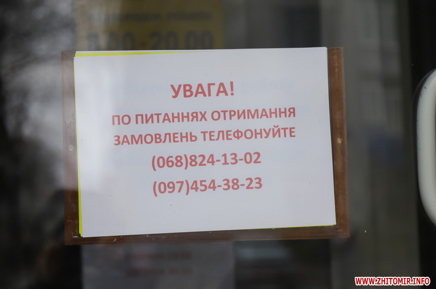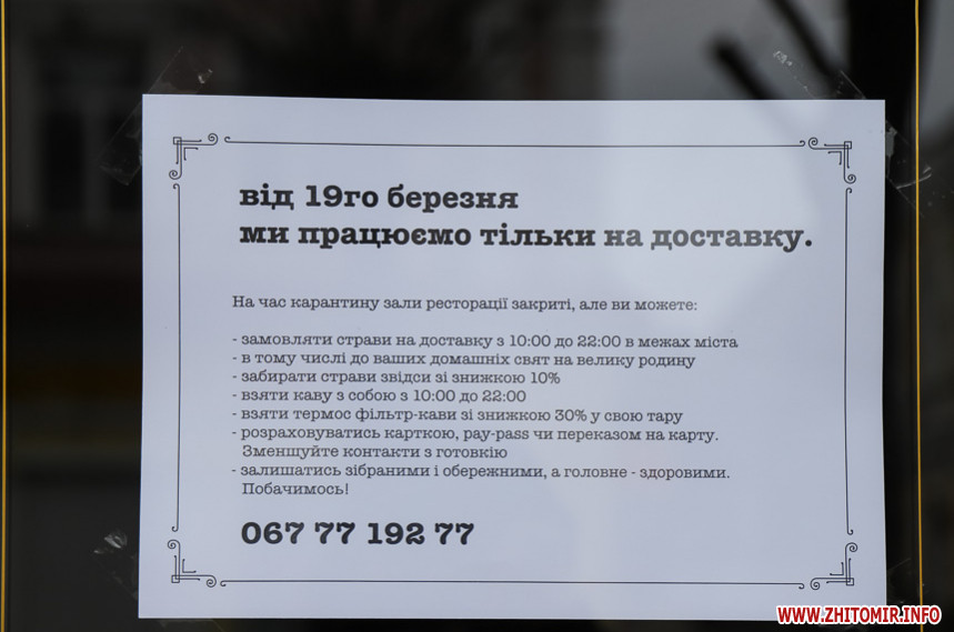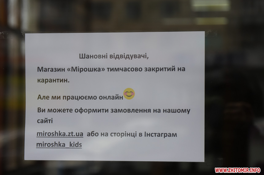 Як повідомляв Житомир.info, 16 березня 2020 року на позачерговому засіданні міськвиконкому ухвалили рішення про закриття усіх закладів у Житомирі, крім продуктових магазинів, аптек та АЗС. Рішення торкнулося і закладів ресторанного господарства, кафе та кав’ярень, які з 19 березня 2020 року мають призупинити свою роботу (крім доставки на замовлення). Однак згодом, за рекомендацією Міністерства економіки України та аби не зірвати посівну, було дозволено в умовах карантину працювати закладам, що реалізовують насіння й саджанці, а також зоомагазинам, з обов’язковим дотриманням усіх санітарно-гігієничних норм. Відповідне рішення виконком прийняв 26 березня.