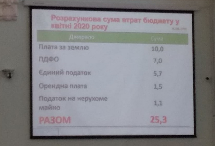 Розрахункові втрати міського бюджету за квітень 2020 року становлять 25,3 млн грн (фото таблиці, яку демонстрували депутатам на сесії).