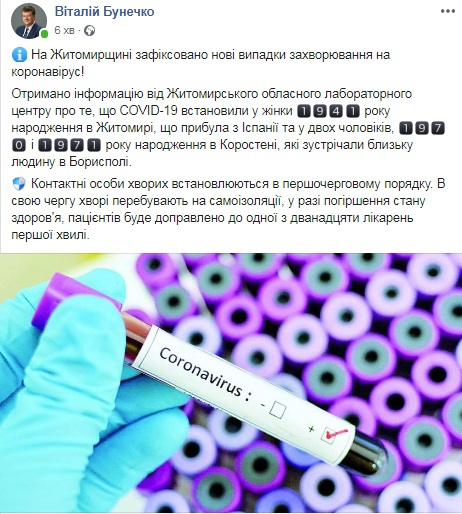 Голова Житомирської ОДА Віталій Бунечко написав у Facebook, що у Коростені захворіли двоє чоловіків 1970 і 1971 року народження, які зустрічали близьку людину в Борисполі.