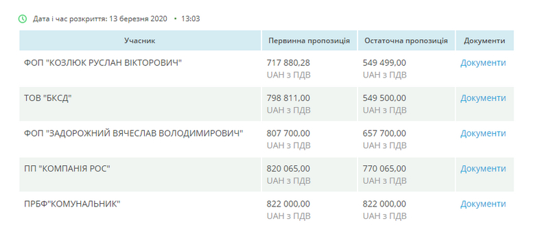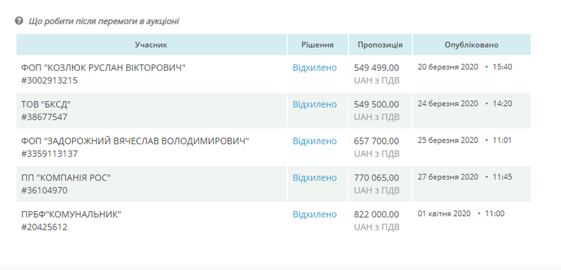 Аукціон розпочався 13 березня. На участь у торгах надійшли пропозиції від 5 компаній: найдешевша від ФОП Козлюк Р.В. – 549 тис.499 грн, найдорожча – від ПРБФ «Комунальник» - 822 тис. грн.