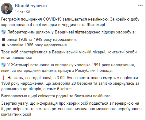 На своїй сторінці у Facebook голова Житомирської ОДА Віталі Бунечко написав про нові зафіксовані випадки захворювання на коронавірус.