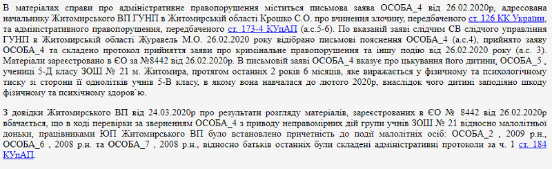 «У письмовій заяві ОСОБА_4 вказує про цькування його дитини, ОСОБА_5, учениці 5-Д класу ЗОШ № 21 м. Житомира, протягом останніх 2 років 6 місяців, яке виражається у фізичному та психологічному тиску зі сторони її однолітків учнів 5-В класу, в якому вона навчалася до лютого 2020 р, внаслідок чого дитині заподіяно шкоду фізичному та психічному здоров`ю», – вказано у матеріалах суду.