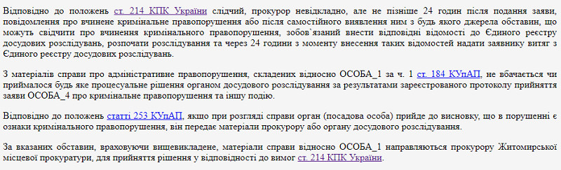 То ж суд постановив «матеріали справи про адміністративне правопорушення, передбаченого ч.1 ст.184 КУпАП, відносно ОСОБА_1 направити прокурору Житомирської місцевої прокуратури, для прийняття рішення у відповідності до вимог ст. 214 КПК України».