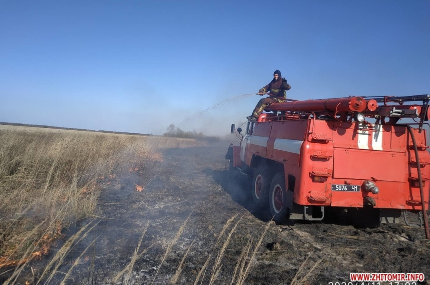 «Зокрема, вигоріла суха трава загальною площею 55 га у 16 районах області. При чому через пожежі маємо і вщент зруйновані вогнем будівлі, і перекидання полум’я від сухої трави на паркан та дровітник, господарчі та житлові будівлі й торф, горіла трава і в районі цвинтаря. Двічі також рятувальники виїжджали на гасіння смітників у м. Андрушівці та на стихійному сміттєзвалищі на околиці Брусилова. Вже сьогодні зранку Пулинські рятувальники у с. Стрибіж допомогли водієві вантажного автомобіля RENAULT загасити причіп з 6 тоннами деревного вугілля», – повідомляють рятувальники.