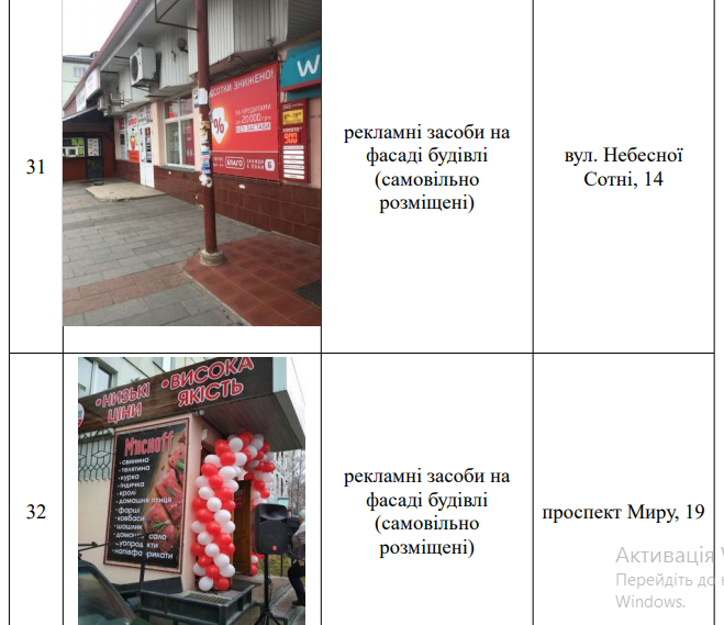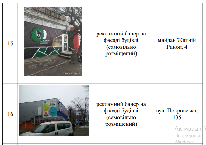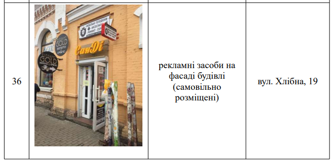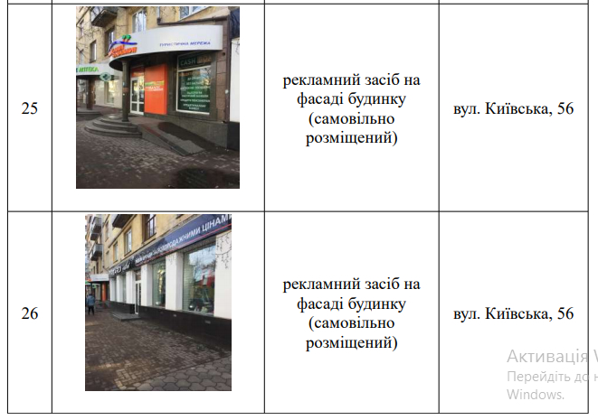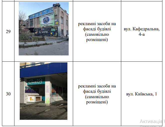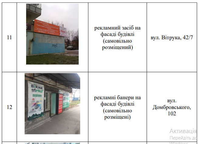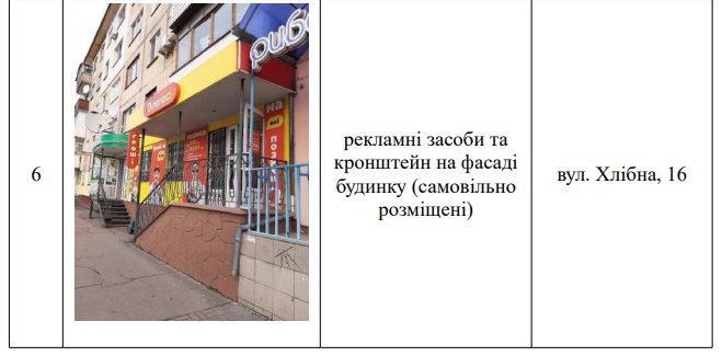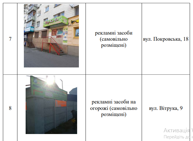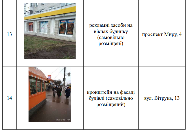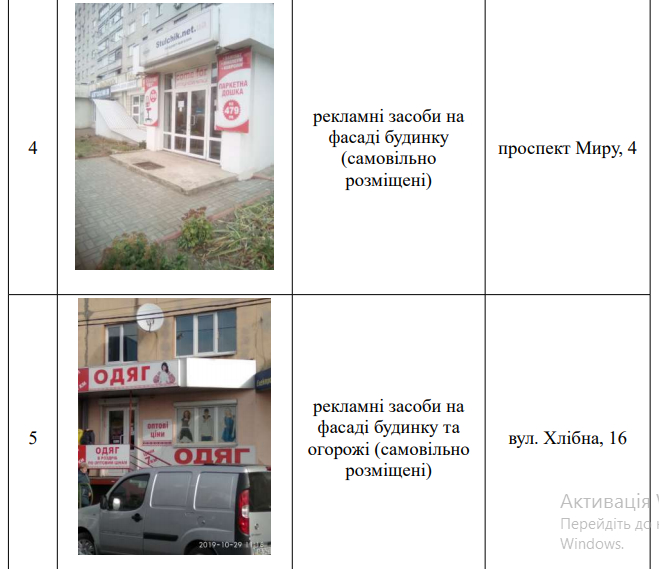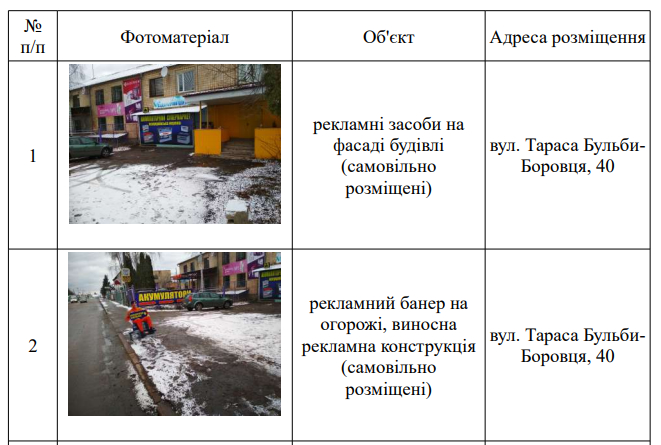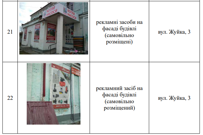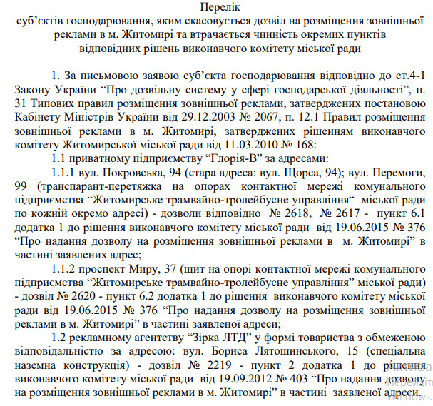 У додатку – перелік об’єктів зовнішнього господарювання, яким скасовується дозвіл на розміщення зовнішньої реклами. Мова йде про ПП «Глорія-В» та рекламне агентство «Зірка ЛТД», для них дозвіл на розміщення реклами скасовується за кількома адресами.