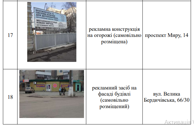 ПЕРЕЛІК самовільно розмішених або розміщених за відсутності діючого дозволу спеціальних конструкцій зовнішньої реклами в м. Житомирі, що підлягають демонтажу: