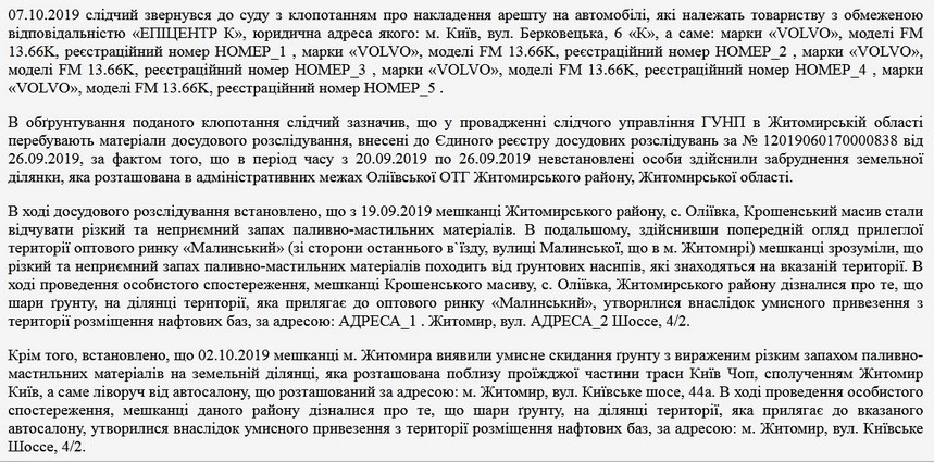 Корольовський районний суд м.Житомира ухвалою від 9 жовтня 2019 року відмовив у задоволенні клопотання слідчого щодо арешту 5 автомобілів VOLVO FM 13,66К, які належать ТОВ «Епіцентр К»: вантажівки перевозили ґрунту, який має різкий та неприємний запах паливно-мастильних матеріалів та ймовірно здійснює забруднення навколишнього середовища.