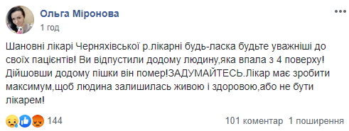 «Шановні лікарі Черняхівської районної лікарні, будь ласка, будьте уважніші до своїх пацієнтів! Ви відпустили додому людину, яка впала з 4 поверху! Дійшовши додому пішки, він помер», – йдеться у дописі.