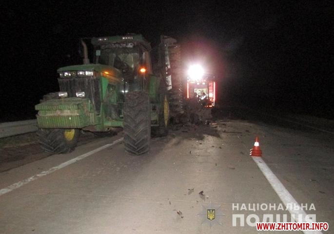 «Попередньо, водій автомобіля «Peugeot 405», 30-річний житель м. Коростеня, рухаючись по неосвітленій ділянці дороги, здійснив зіткнення з трактором «John Deere» під керуванням 48-річного жителя Київщини, що рухався у попутному напрямку. У результаті ДТП водій легковика та його пасажир, 19-річний житель м. Коростеня, загинули на місці події. Ще одного пасажира цього автомобіля, 21-річного коростенця, з травмами ушпиталили до реанімаційного відділення Малинської райлікарні. Нині триває встановлення всіх причин та обставин події», – йдеться в повідомленні.