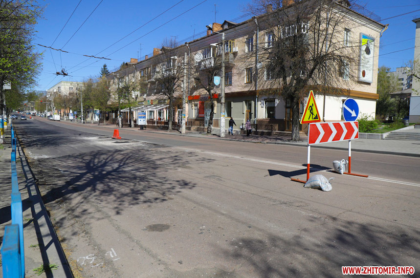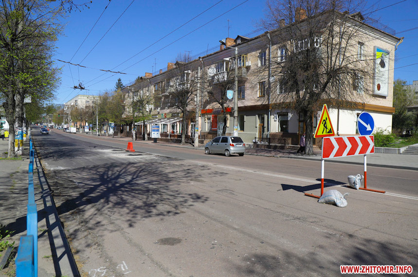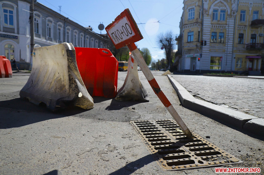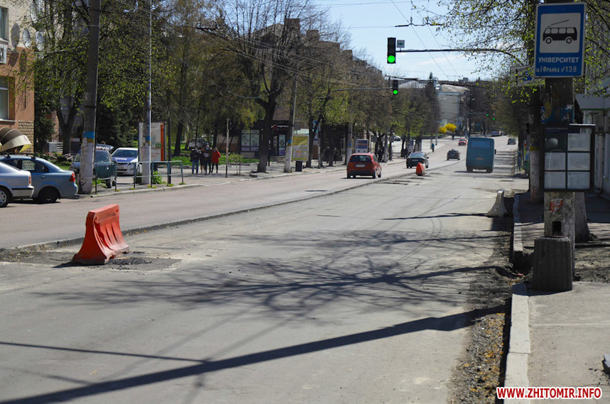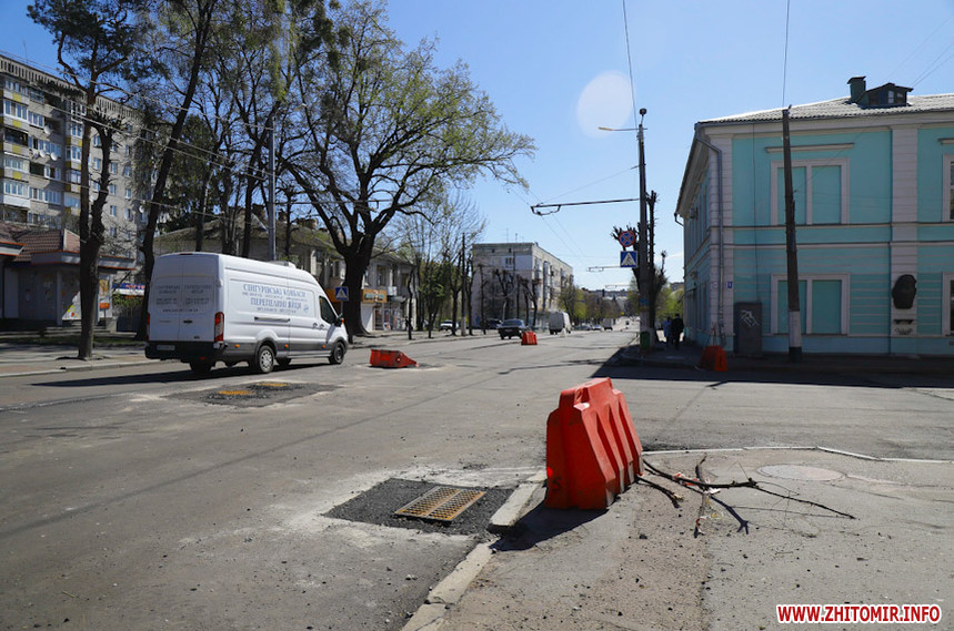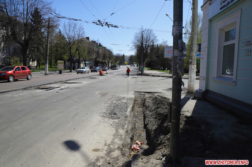 У першій половині дня 17 квітня на Бердичівській робітників та техніки немає. На відрізку дороги встановлені обмежувальні знаки, розриті тротуари, ями засипані камінням, навколо люків видно «свіжий» ремонт.