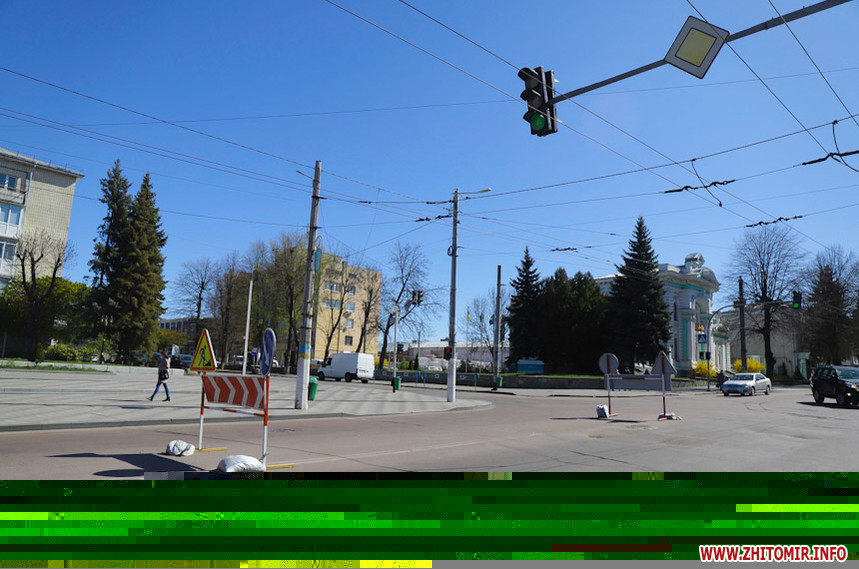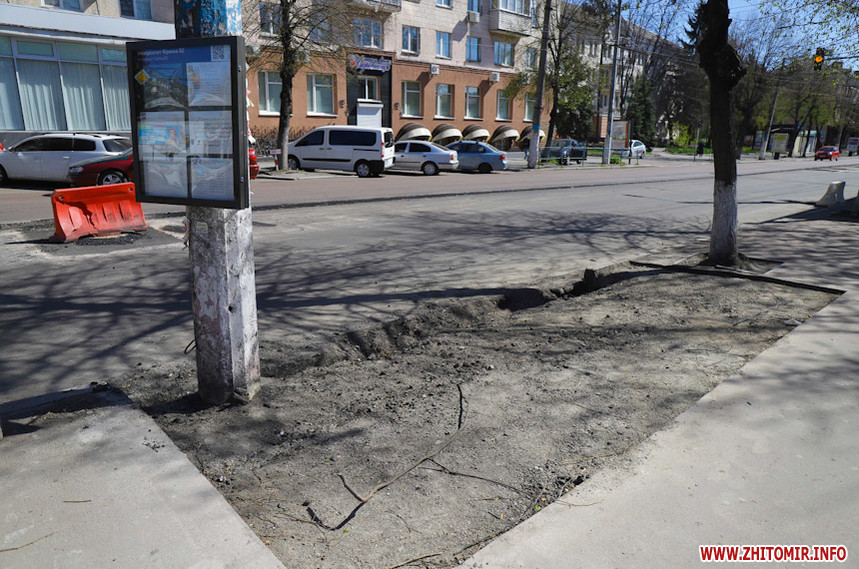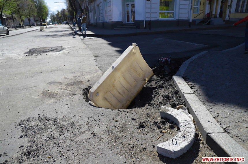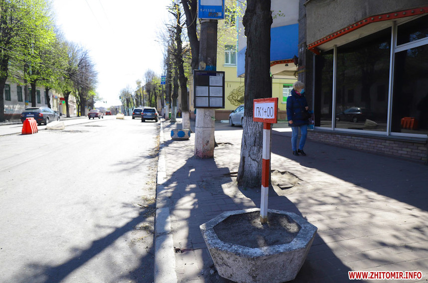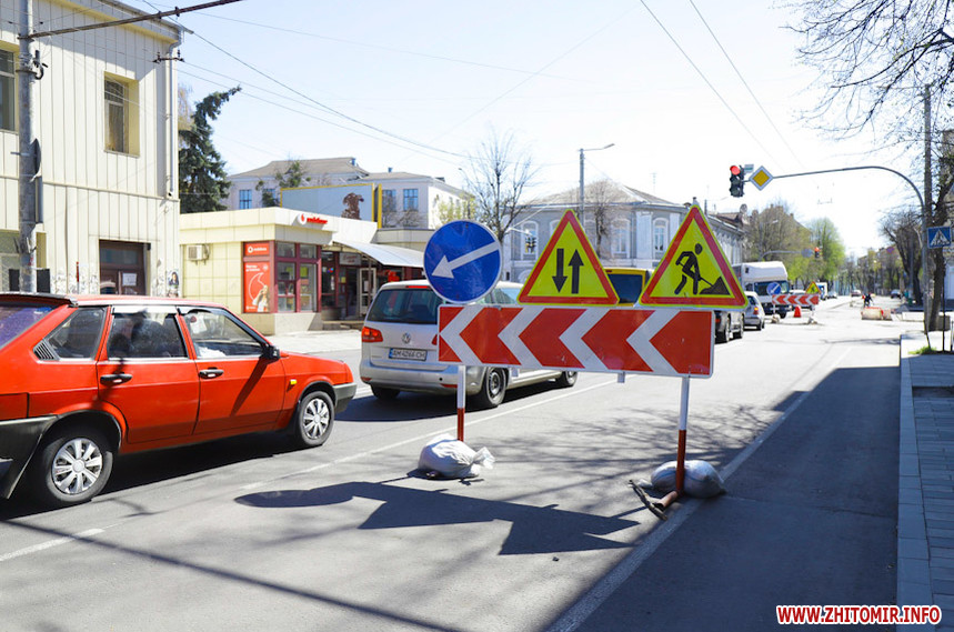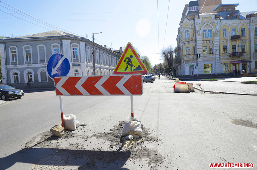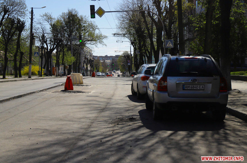 У першій половині дня 17 квітня на Бердичівській робітників та техніки немає. На відрізку дороги встановлені обмежувальні знаки, розриті тротуари, ями засипані камінням, навколо люків видно «свіжий» ремонт.