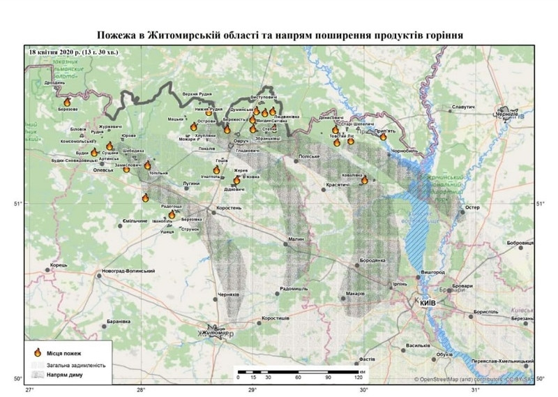 Як повідомляв Житомир.info, 16 квітня 2020 року на території 9 лісгоспів Житомирської області почалися лісові пожежі в результаті підпалу сільгоспугідь та випалення трави в домогосподарствах. За наявності поривчастого шквального вітру більше 30м/с вогонь швидко розповсюджувався на великі площі лісів і на будинки. Зокрема загорілися ліси поблизу сіл в Овруцькому та Олевському районах.