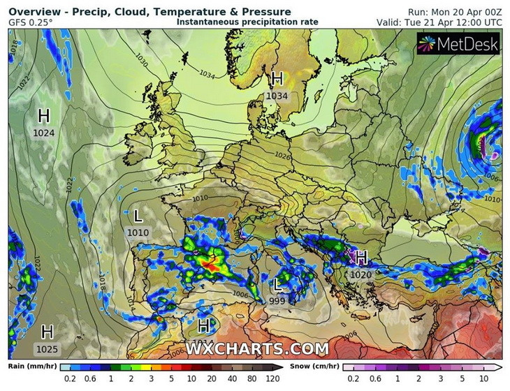 Метеоролог Наталія Діденко інформує, що в Україні завтра, 21-го квітня, вітер північний, у східних областях – північно-західний. Станом на 20 квітня дощі спостерігаються у східній частині України, в Криму, а також у приазовській частині Запоріжжя. 21 квітня дощі ймовірні на Лівобережній Україні (див. карту). На решті території – суха погода.