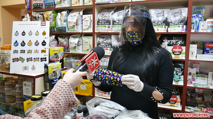 «Ми маємо масочки ось такі звичайні в сердечка, вони мають вісім шарів марлі. Такі маски коштують 25 грн. Також ми маємо дезінфектори, які коштують 60 грн. Коли заходять до нас вагітні жінки, то маски та дезінфектори ми роздаємо безкоштовно, адже вони у зоні ризику. Також маємо масочки по 20 грн», – розповідає продавчиня зоомагазину Тетяна.