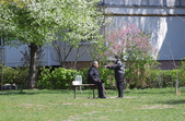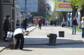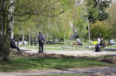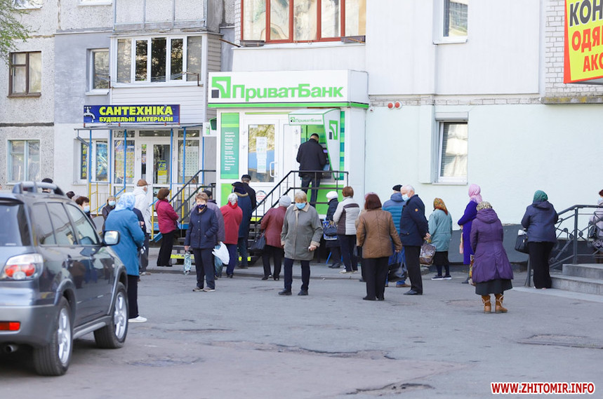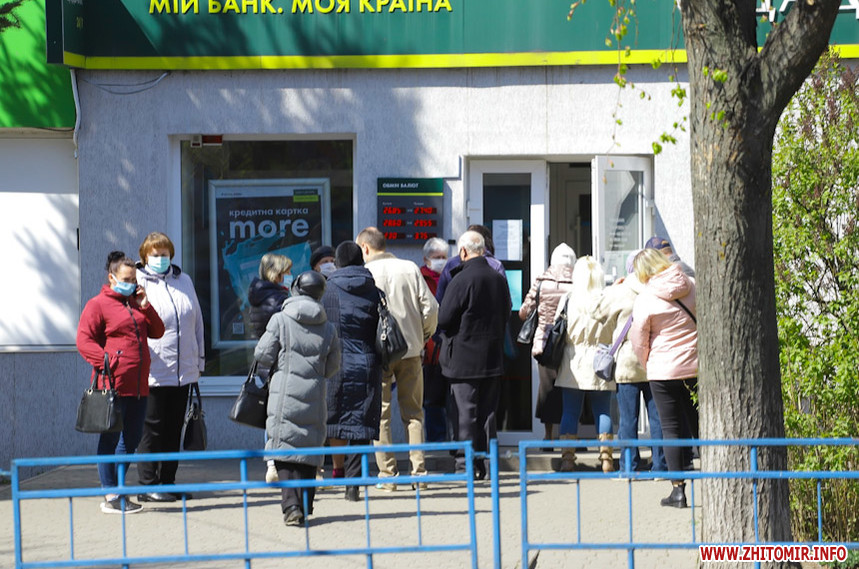 На Польовій у Житомирі 23 квітня людно. Біля банків понад 10 людей утворили черги і не дотримують дистанції. Працюють торгівельні майданчики, які не потрапили під заборону. Дитячі ж майданчики пустують, а от в сквері житомиряни в масках відпочивають на лавках.