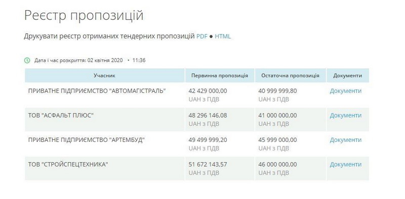 2 квітня 2020 КП “УАШ” провело відкриті торги, участь у них взяло чотири фірми: ПП “Автомагістраль” з остаточною ціновою пропозицією у 40 млн 999 тис. 999 грн 80 коп., ТОВ “Асфальт Плюс” з остаточною ціновою пропозицією у 41 млн грн, ПП “Артембуд” з остаточною ціновою пропозицією у 45 млн 999 тис. та ТОВ “Стройспецтехника” з остаточною ціновою пропозицією 46 млн грн.