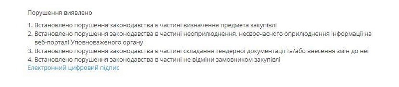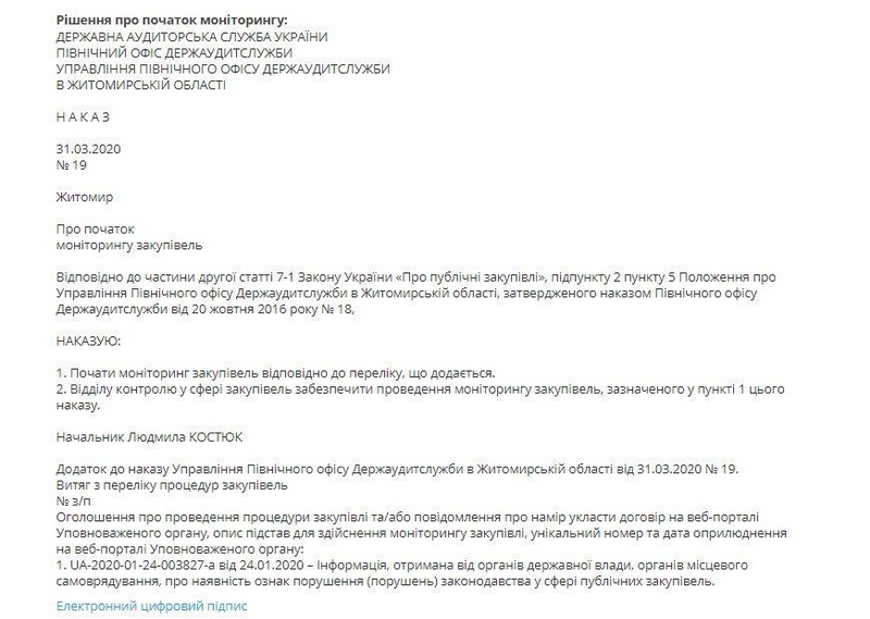Завершився моніторинг 16 квітня, за його результатами управління Північного офісу Держаудитслужби в Житомирській області виявило порушення законодавства в частині визначення предмета закупівлі, порушення в частині неоприлюднення, несвоєчасного оприлюднення інформації на веб-порталі уповноваженого органу та встановлено порушення законодавства в частині складання тендерної документації та/або внесення змін до неї. Окрім того, аудитори встановили порушення в частині не відміни замовником закупівлі.