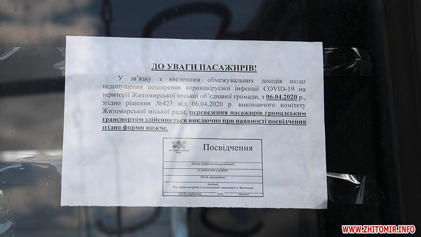 Нагадаємо, з 6 квітня 2020 у Житомирській міській ОТГ працівники підприємств, установ та організацій, які продовжують працювати в умовах карантину, мають право користуватися міським громадським транспортом виключно за наявності спеціальної перепустки та засобів індивідуального захисту.