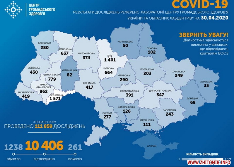 Станом на 9.00 30 квітня в Україні лабораторно підтверджено 10406 випадків COVID-19, з них 540 виявили упродовж останньої доби.