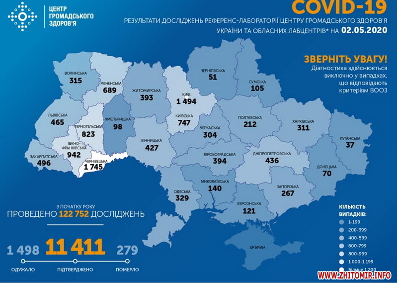 Станом на 9.00 2 травня в Україні лабораторно підтверджено 11411 випадків COVID-19, з них 550 виявили упродовж останньої доби.
