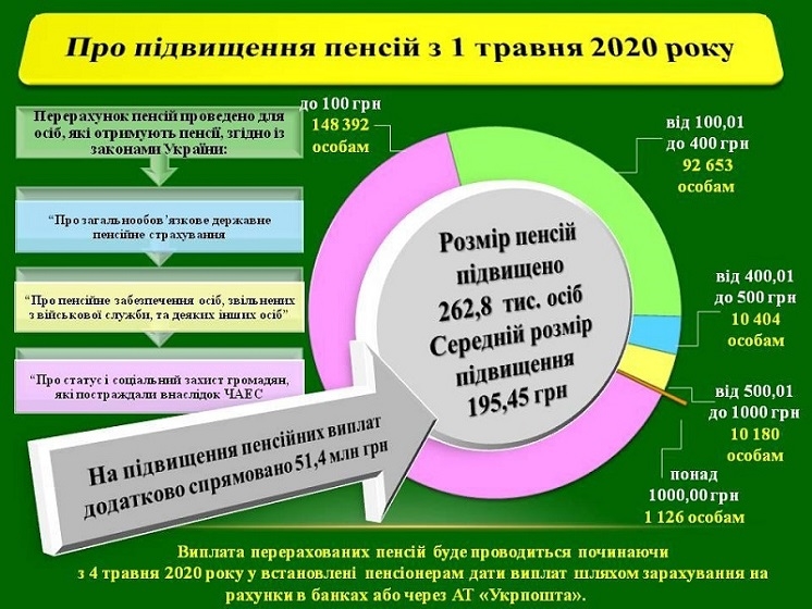 «На виконання постанови Кабінету Міністрів України від 1 квітня 2020 року №251 „Деякі питання підвищення пенсійних виплат і надання соціальної підтримки окремим категоріям населення у 2020 році”, з 1 травня поточного року Головним управлінням Пенсійного фонду України в області проведено перерахунок пенсій із застосуванням коефіцієнта збільшення показника середньої заробітної плати (доходу) в Україні, з якої сплачено страхові внески, та який враховується для обчислення пенсії, в розмірі 1,11 (виділено редакцією)», – йдеться у листі.