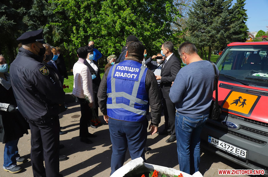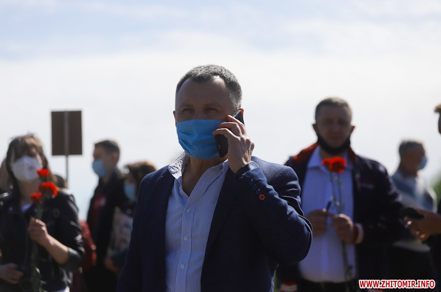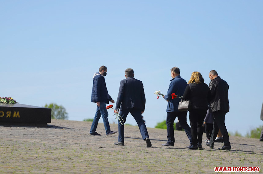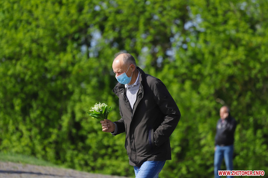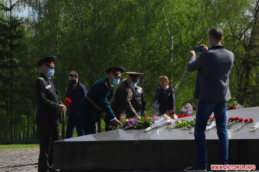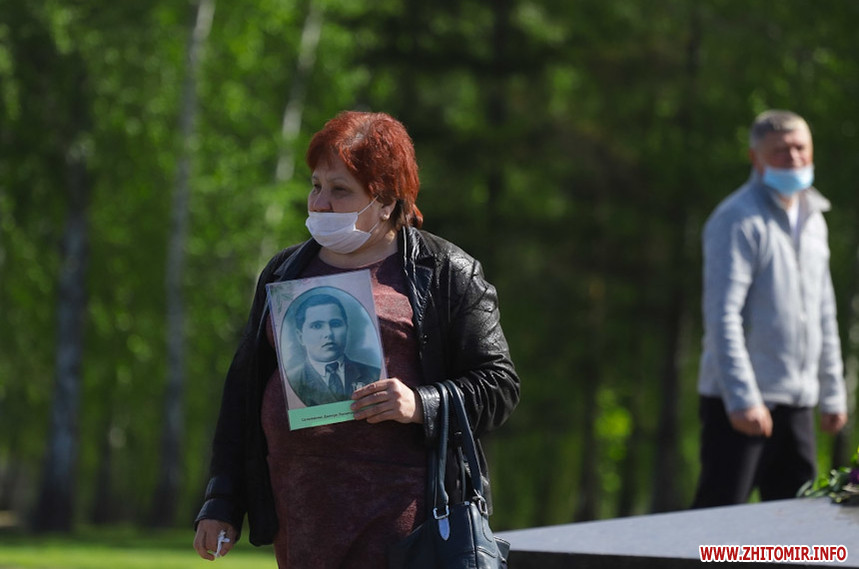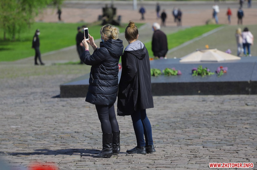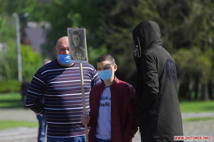 Житомиряни в масках, з квітами, портретами військових та червоними прапорами 9 травня зібралися біля монумента Слави, щоб відзначити День Перемоги над нацизмом у Другій світовій війні.