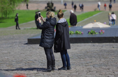 Згодом на автомобілях приїхали люди, які вранці зібрались на майдані Перемоги. Вони вишикувались, щоб нести квіти до монумента Слави. Попереду йшли ветерани, дехто тримав в руках червоні прапори. Люди фотографувались та обіймали ветеранів.