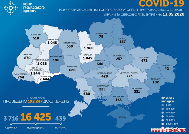 Станом на 9.00 13 травня в Україні лабораторно підтверджено 16425 випадків COVID-19, з них 402 виявлено упродовж останньої доби.