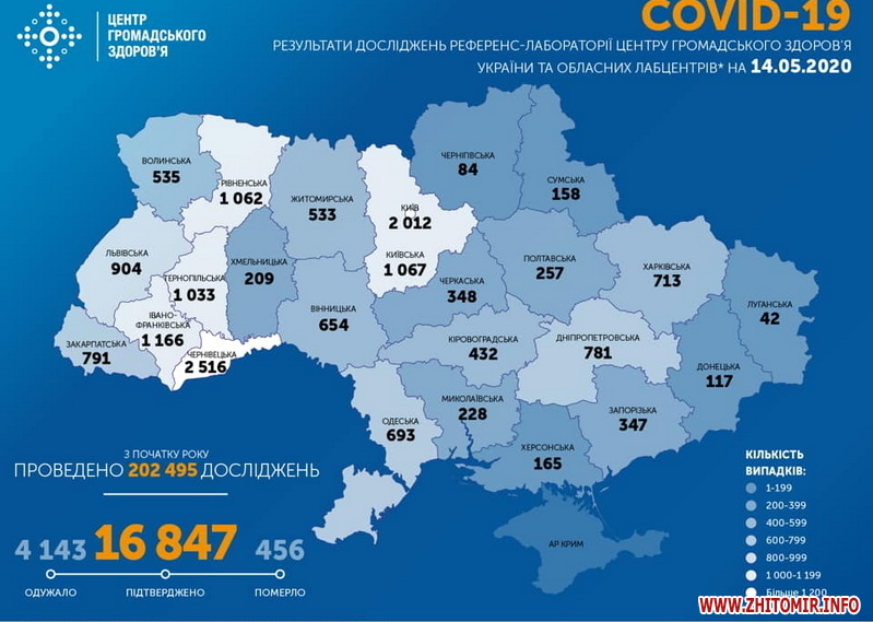 Як повідомляв Житомир.info, станом на 9:00 год. 13 травня 2020 року в Україні лабораторно підтверджено 16425 випадків COVID-19, з них 402 виявлено упродовж останньої доби.