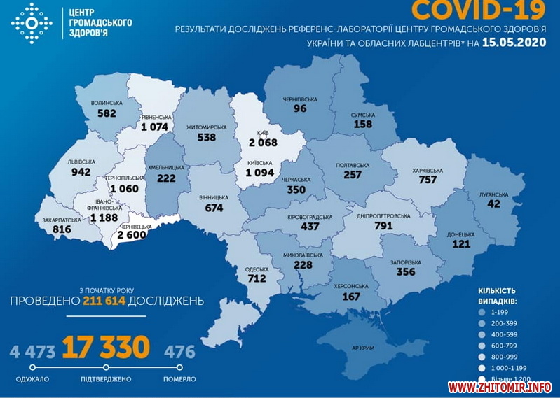 Як повідомляв Житомир.info, станом на 9:00 год. 14 травня 2020 року в Україні лабораторно підтверджено 16 847 випадків COVID-19, з них 422 виявили упродовж останньої доби.