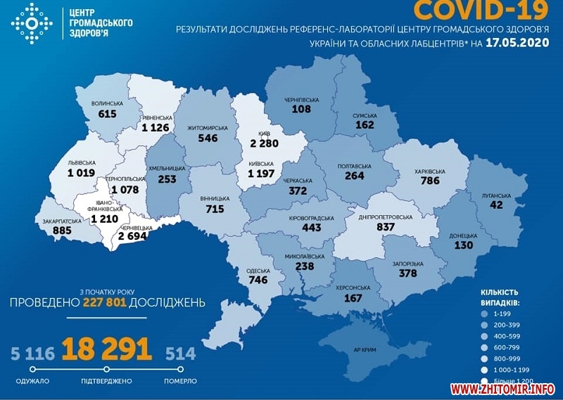 Як повідомляв Житомир.info, станом на 9:30 год. 16 травня 2020 року в Україні лабораторно підтверджено 17 858 випадків COVID-19. Протягом попередньої доби виявили 528 нових інфікувань.