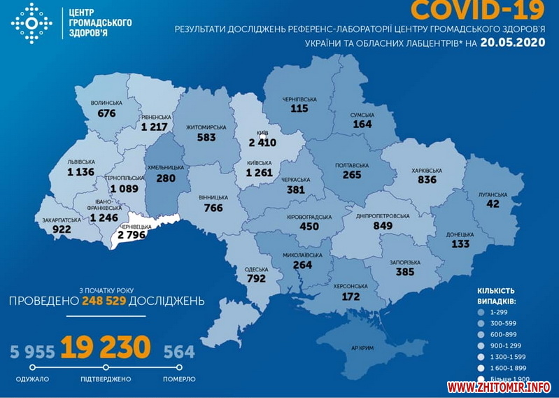 Станом на 9.00 20 травня в Україні лабораторно підтверджено 19230 випадків COVID-19, з них 354 виявили упродовж останньої доби.