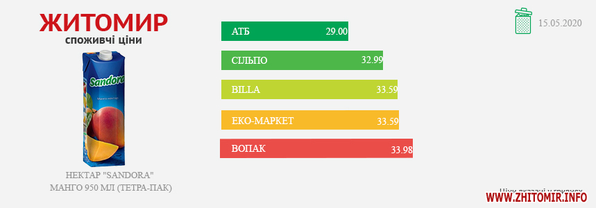 МОНІТОРИНГ ЗДІЙСНЕНО МЕТОДОМ КОНТРОЛЬНОЇ ЗАКУПІВЛІ, У МІСЦЯХ ПРОДАЖУ: AТБ, пр. Миру, 15 А, Billa, пр. Миру, 15, Вопак, вул. Київська, 87, ЕКО-маркет, вул. Мала Бердичівська, 2/7, Сільпо, майдан Житній ринок, 1