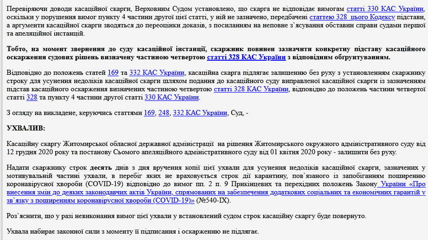 Нагадаємо, постановою від 1 квітня 2020 року Сьомий апеляційний адміністративний суд залишив без задоволення скаргу Житомирської облдержадміністрації на рішення Житомирського окружного адміністративного суду від 12 грудня 2019 року, який визнав скасував розпорядження голови ОДА про затвердження складу громадської ради.
