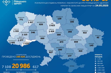 Станом на ранок 24 травня в Україні підтверджено 20 986 випадків COVID-19, з них 7108 одужали, 617 померли. Протягом останньої доби лабораторно підтверджено 406 випадків.