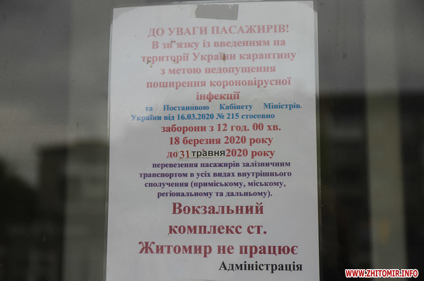 Не запрацював залізничний вокзал. На дверях оголошення, що вокзальний комплекс станції Житомир не працює до 31 травня.