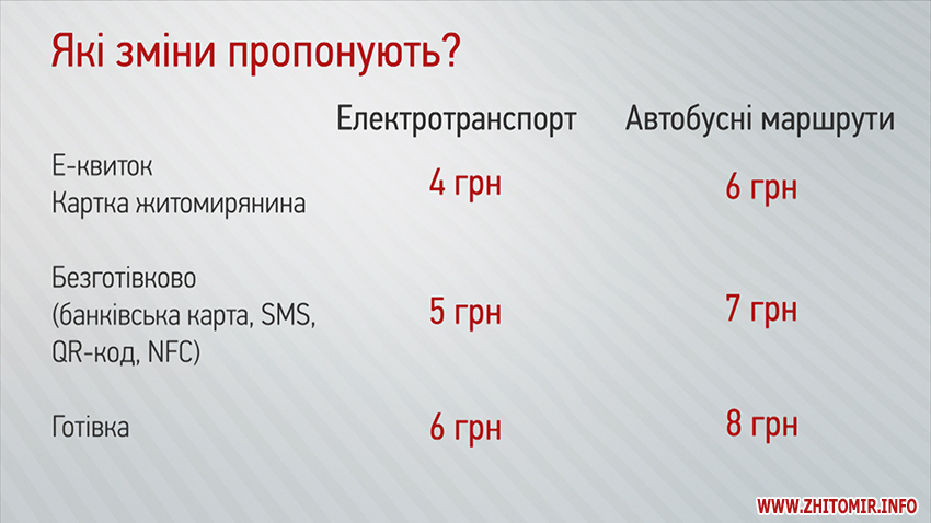 В автобусах вартість проїзду за умови оплати «Карткою житомирянина» становитиме 3 гривні без обмежень у часі. Готівкою потрібно буде заплатити 3 гривні, але лише з 10 до 16 години. В інший час готівкою доведеться сплачувати повну вартість проїзду.