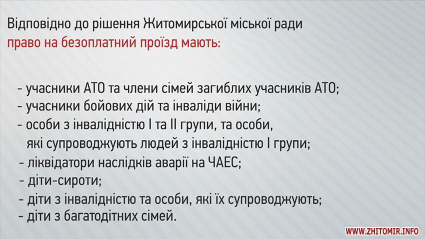 Відповідно до рішення Житомирської міської ради право на безоплатний проїзд мають: