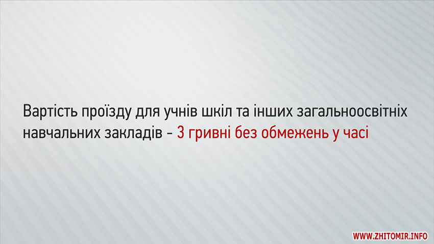 Для пільгових категорій громадян проїзд в електротранспорті буде безкоштовним, якщо в них є «Картка житомирянина». Готівкою треба буде сплатити 3 гривні.