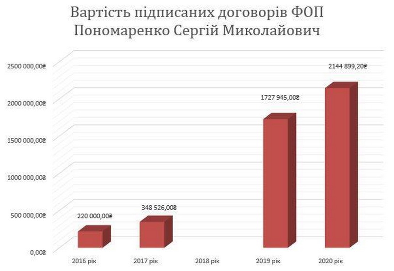 Починаючи з 2016 року, ФОП Пономаренко Сергій Миколайович підписав 14 договорів з бюджетними установами Новограда-Волинського загальною вартістю 4 млн 441 тис. 370 грн 20 коп. Всі договори були укладені за договірною процедурою, без торгів.