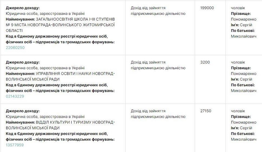 У своїй декларації за 2019 рік, Олена Пономаренко вказала дохід від зайняття підприємницькою діяльністю свого чоловіка: серед яких 199 тис. грн від ЗОШ І-ІІІ ступенів № 9 міста Новоград-Волинського, 3 тис. 200 грн від управління освіти і науки Новоград-Волинської міської ради та 27 тис. 150 грн від відділу культури і туризму Новоград-Волинської міської ради.