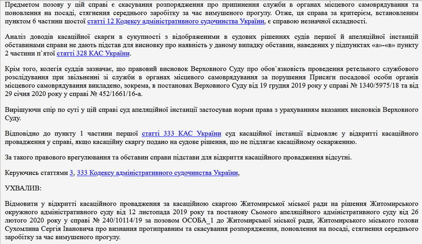 Рішенням від 22 листопада 2019 року Житомирський окружний адміністративний суд поновив на посаді звільненого начальника управління житлового господарства Житомирської міської ради Юрія Мостовича, Також міська рада має нарахувати та виплатити Мостовичу середній заробіток за час вимушеного прогулу за період з 29.07.2019 до 12.11.2019. Сьомий апеляційний адміністративний суд постоновою від 26 лютого 2020 року зобов’язав Житомирську міську раду виплатити Юрію Мостовичу 64 тис. грн за час вимушеного прогулу й залишив без змін рішення суду першої інстанції. Ухвалою від 21 квітня Верховний суд відмовив Житомирській міській раді у відкритті касаційного провадження.