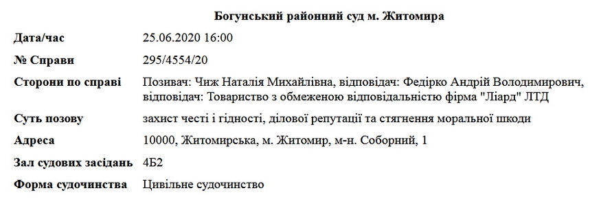 29 квітня 2020 року Богунський районний суд м.Житомира відкрив провадження за позовом Наталії Чиж.