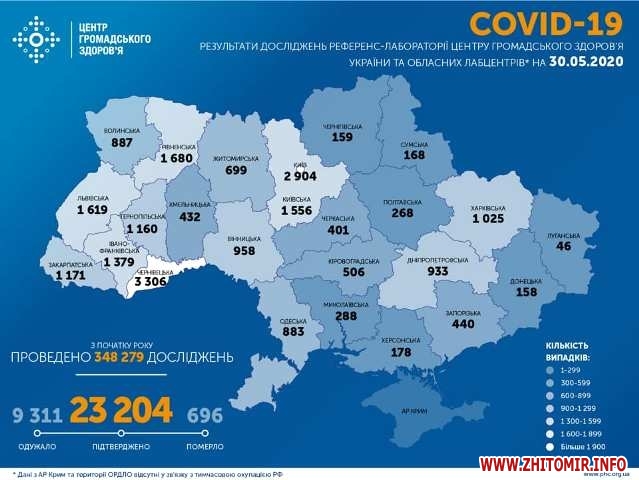 Станом на 9.30 год. 30 травня в Україні лабораторно підтверджено 23 204 випадків COVID-19, з них 393 - виявлені упродовж останньої доби. За весь період одужали 9311 людини, померли 696 пацієнтів.
