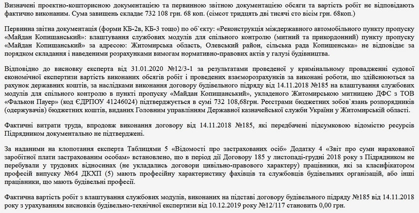 Зауважимо, що зазначені фінансові операції відбувалися до 20 лютого – цього дня Сергію Гринчуку повідомили про підозру у розтраті майна в особливо великих розмірах. Мова йде про реконструкцію міждержавного автомобільного пункту пропуску «Майдан Копищанський». Нижче – скріншоти з ухвали Хмельницького міськрайонного суду від 16 квітня 2020 року, який відмовив у задоволенні клопотання прокурора щодо продовження Гринчуку цілодобового домашнього арешту, який закінчився 18 квітня.