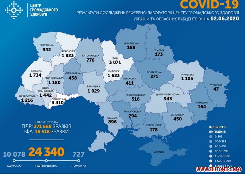 Як повідомляв Житомир.info, станом на 9:001 червня 2020 року в Україні лабораторно підтверджено 24 012 випадків COVID-19, одужали 9690 та померли 718 осіб.