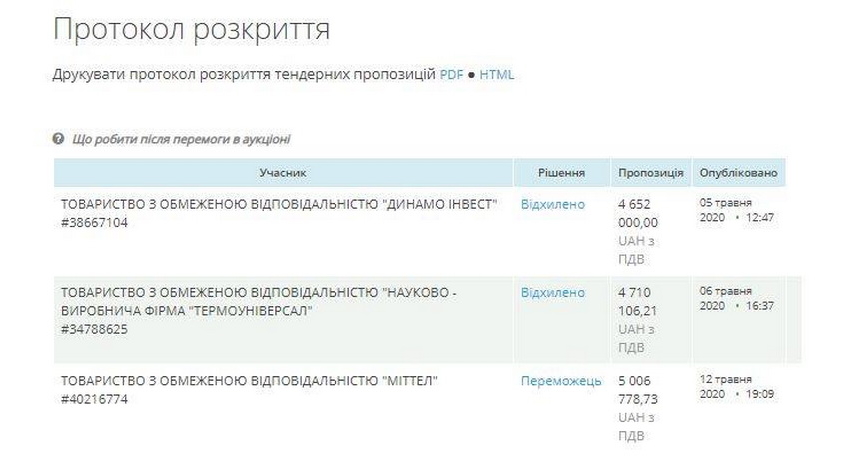 Участь у торгах взяли три фірми: ТОВ «Динамо Інвест» з остаточною ціновою пропозицією у 4 млн 652 тис. грн, ТОВ «Науково-виробнича фірма “Термоуніверсал”» з остаточною ціновою пропозицією у 4 млн 710 тис. 106 грн 21 коп та ТОВ «Міттел» з остаточною ціновою пропозицію у 5 млн 6 тис. 778 грн 73 коп.