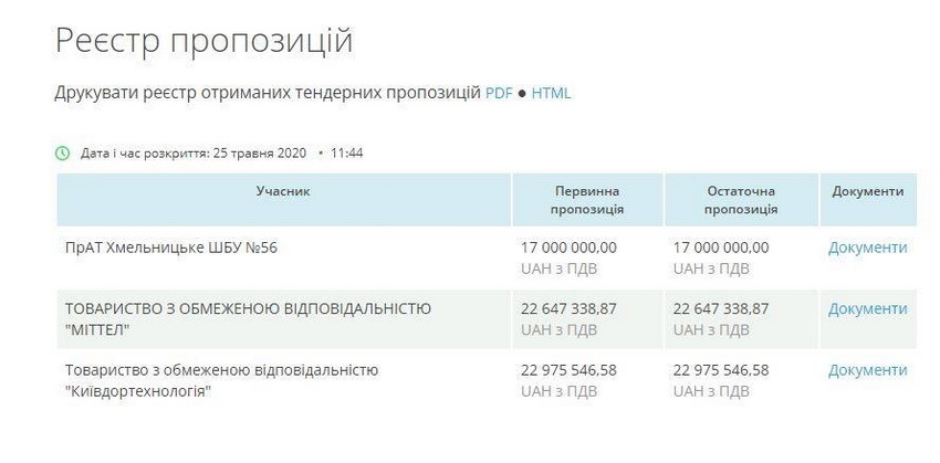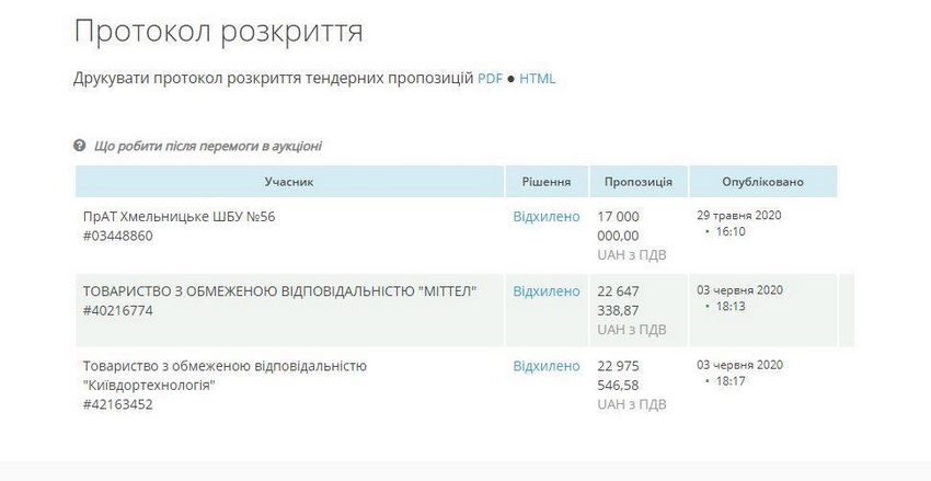 Аукціон розпочався 25 травня. На участь у торгах надійшли пропозиції від трьох компаній: ПрАТ “Хмельницьке ШБУ №56” з остаточною ціновою пропозицією у 17 млн грн, ТОВ “Міттел” з остаточною ціновою пропозицією у 22 млн 647 тис. 338 грн 87 коп. та ТОВ “Київдортехнологія” з остаточною ціновою пропозицією у 22 млн 975 тис. 546 грн 58 коп.